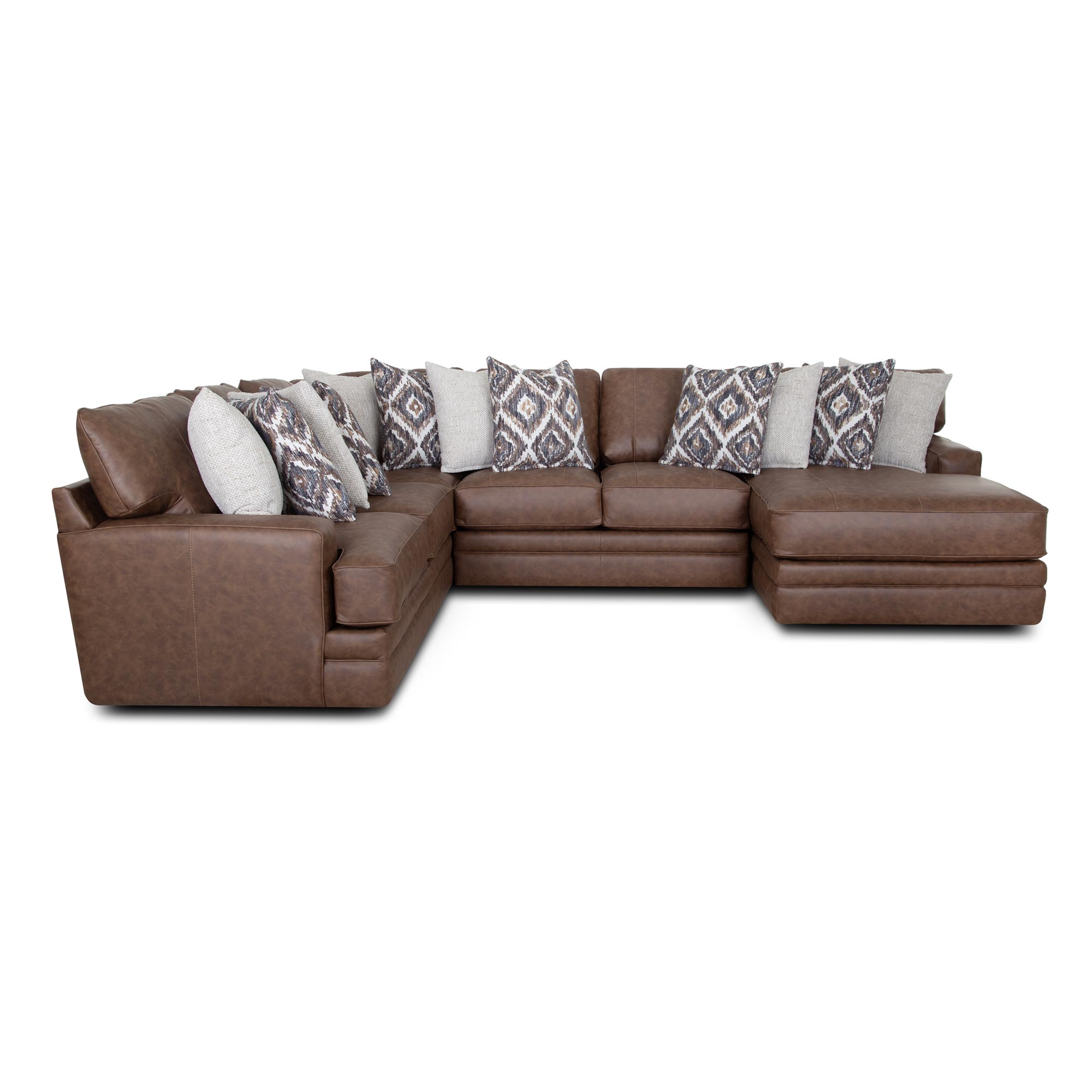 The 934 Asheville Sectional delivers relaxed sophistication and everyday comfort, with flexible configuration options designed to fit your space beautifully. Upholstered in a rich, vintage-inspired brown fabric with a subtle leather-like look, Asheville brings warmth, depth, and a slightly rugged character to any living area. Coordinating accent pillows feature soft neutrals and geometric patterns that add visual interest while maintaining a cohesive, inviting feel. Low-profile hidden legs complete the look with a modern, streamlined silhouette.